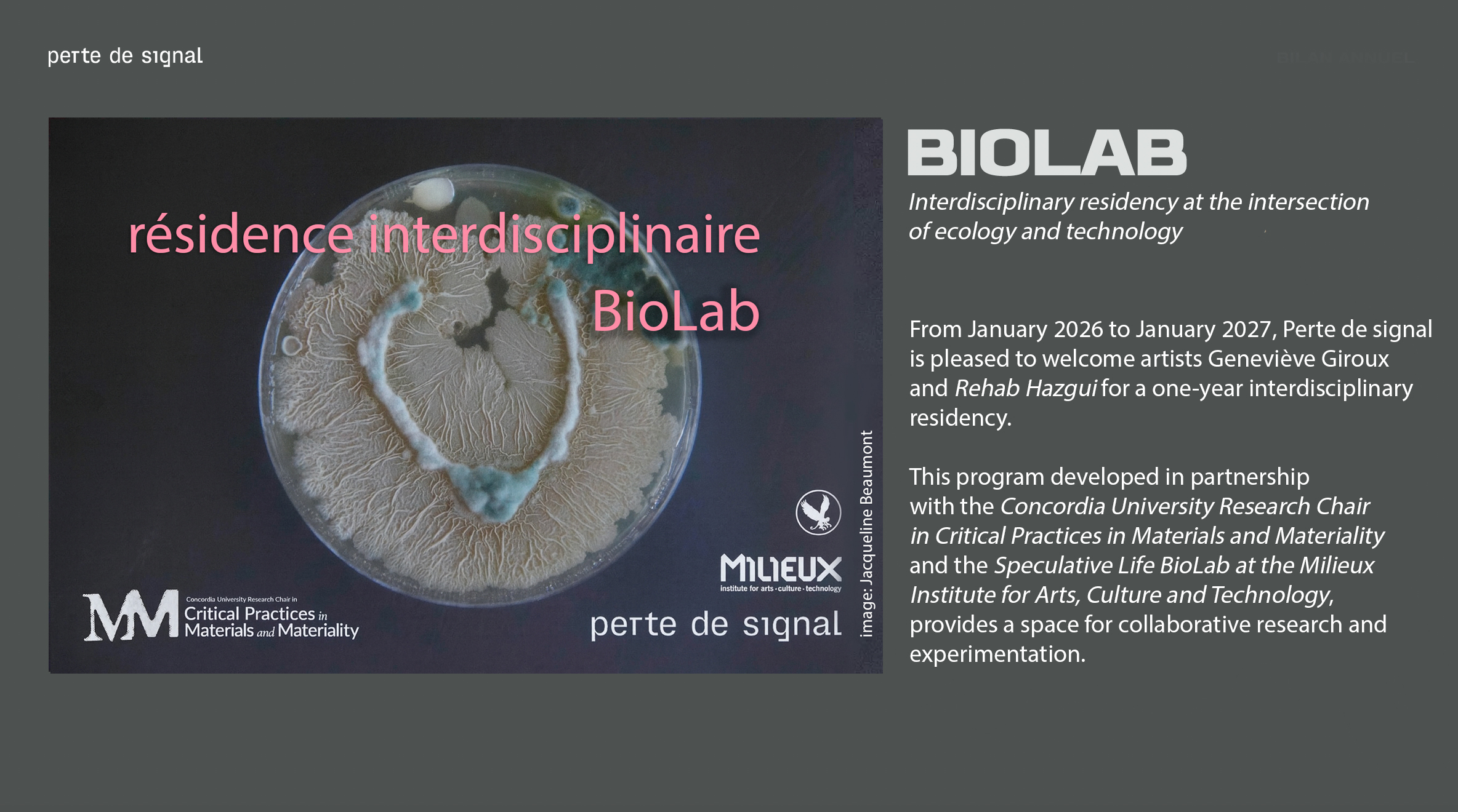 From January 2026 to January 2027, Perte de signal is pleased to welcome artists Geneviève Giroux and Rehab Hazgui for a one-year interdisciplinary residency. This program, developed in partnership with the Concordia University Research Chair in Critical Practices in Materials and Materiality and the Speculative Life BioLab at the Milieux Institute for Arts, Culture and Technology, provides a space for collaborative research and experimentation.